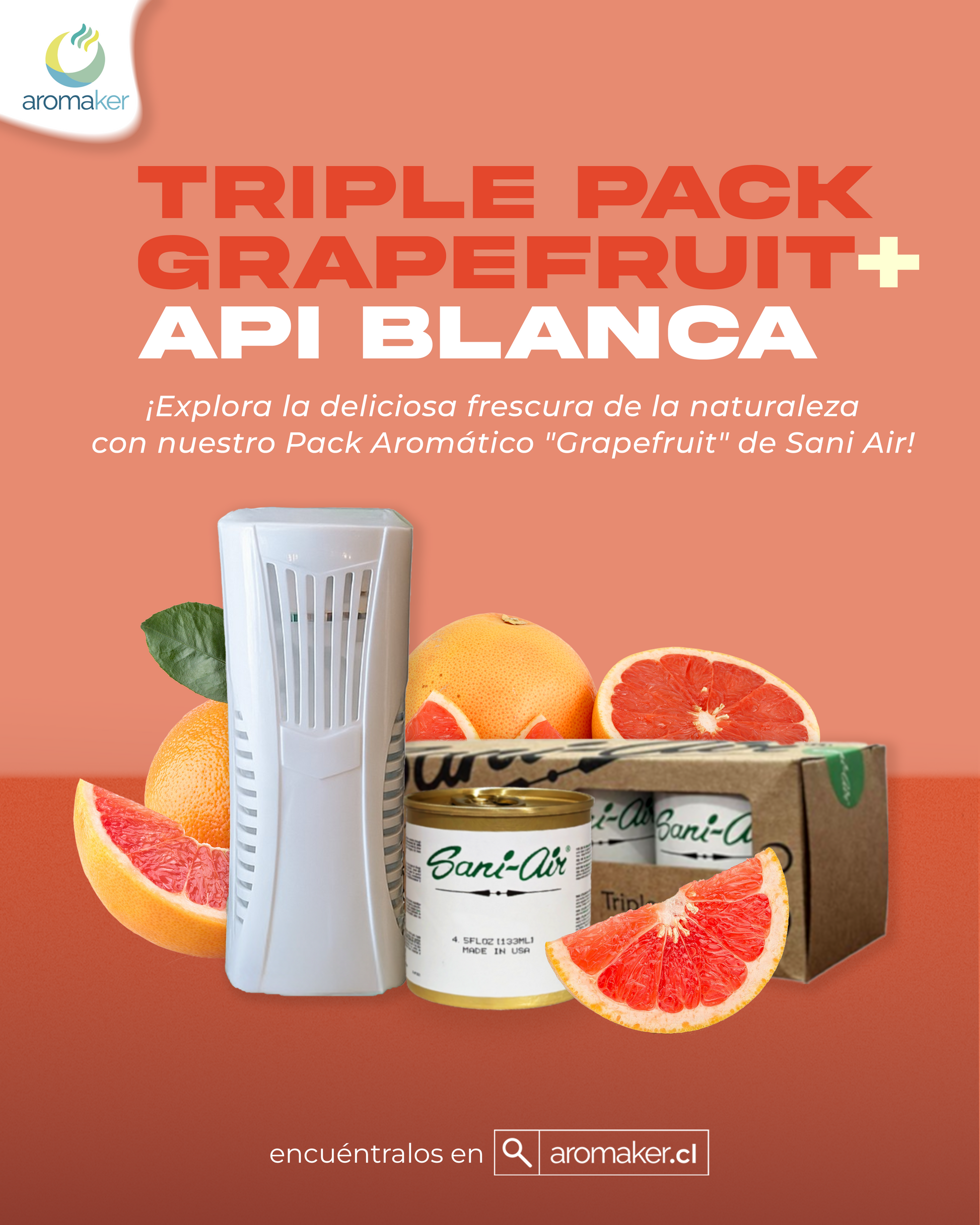 El pack incluye el difusor eléctrico API de color blanco, 3 latas de aroma Grapefruit