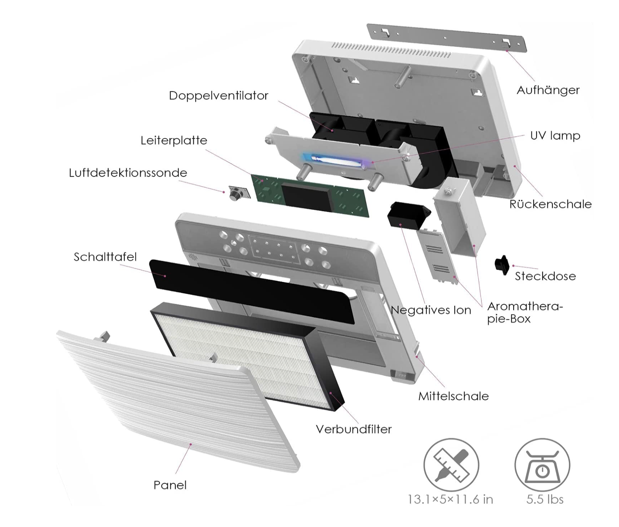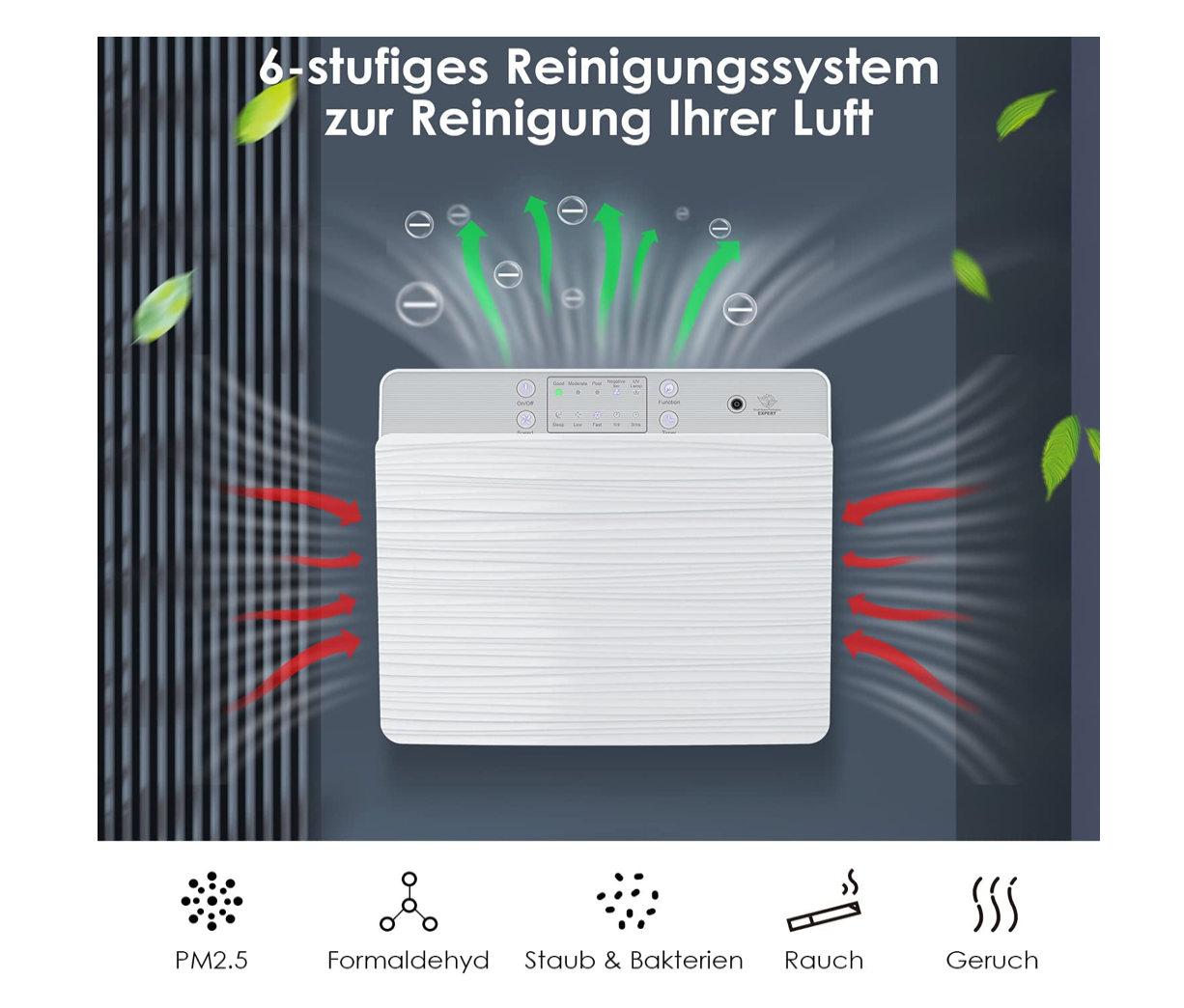 Es un purificador de aire iónico a control remoto que posee una potencia de 8,5W.